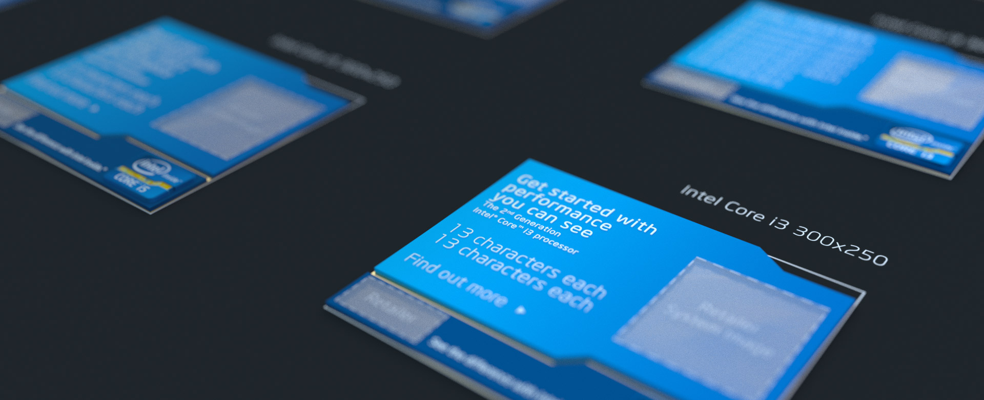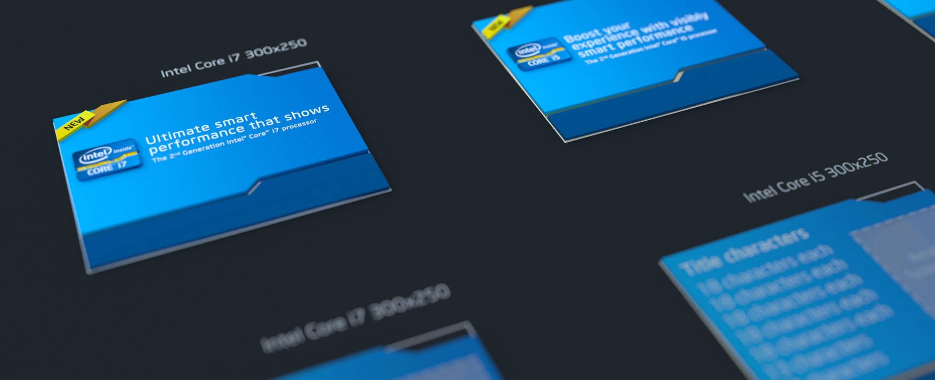 Fully customisable template ads were built for the full range of next gen processors on offer. Building from Intel’s brand we created templates in sizes to suit any ad placement, in different styles depending on the chosen processor.